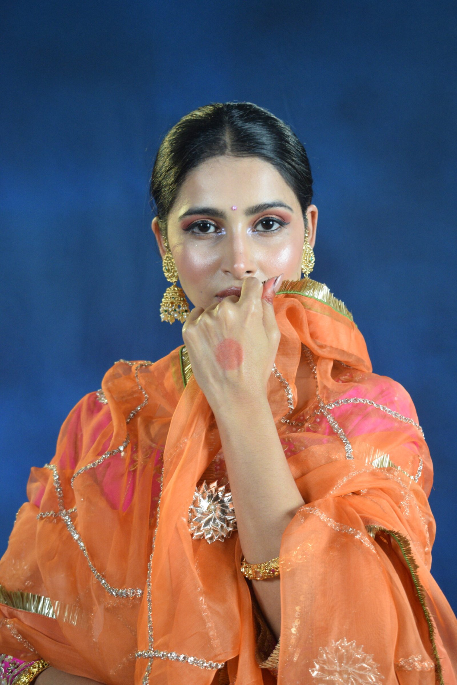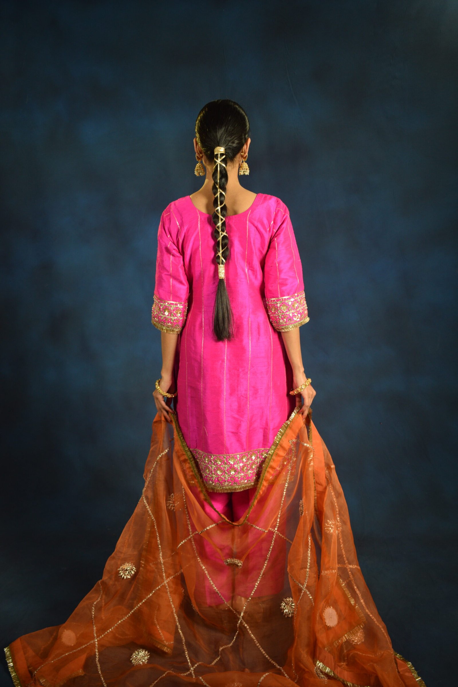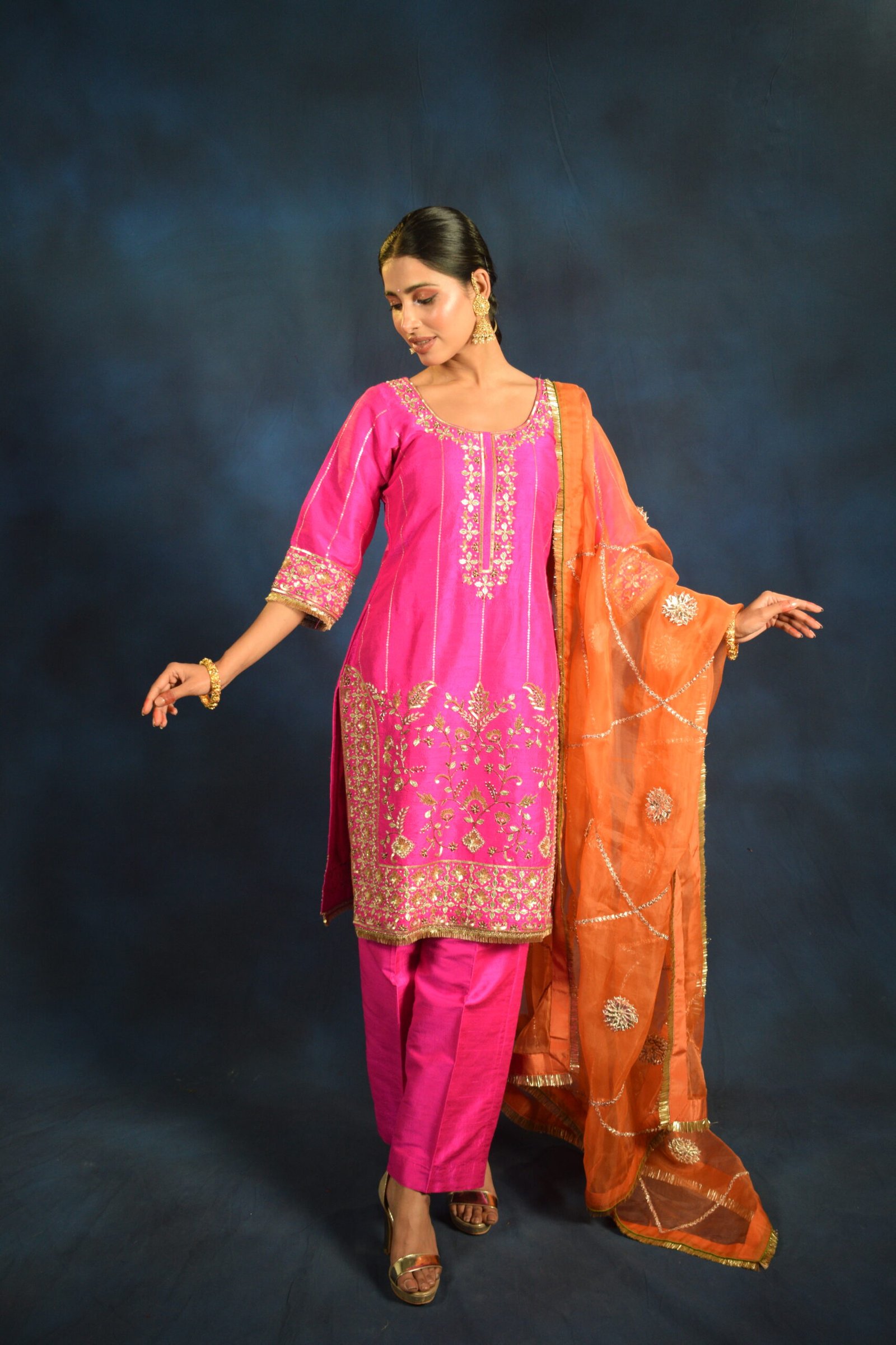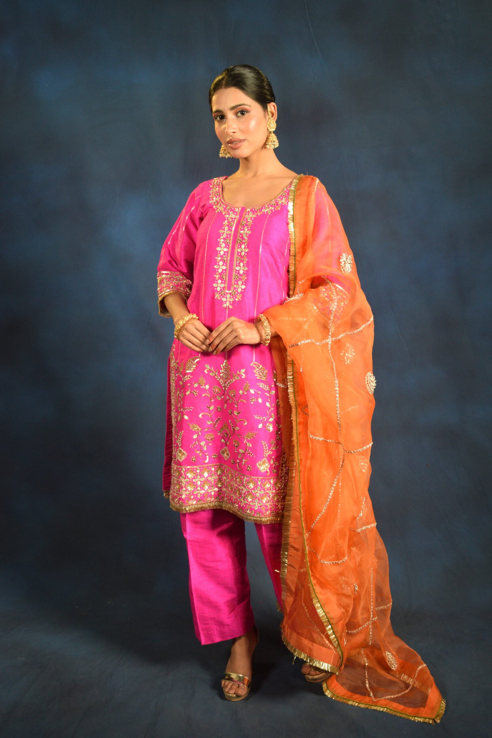 The kurta is beautifully paired with matching straight-fit pants and a contrasting sheer orange dupatta, detailed with delicate gold accents that add graceful movement and festive charm. Designed to flatter and flow, this set is ideal for weddings, festive gatherings, and celebratory evenings.