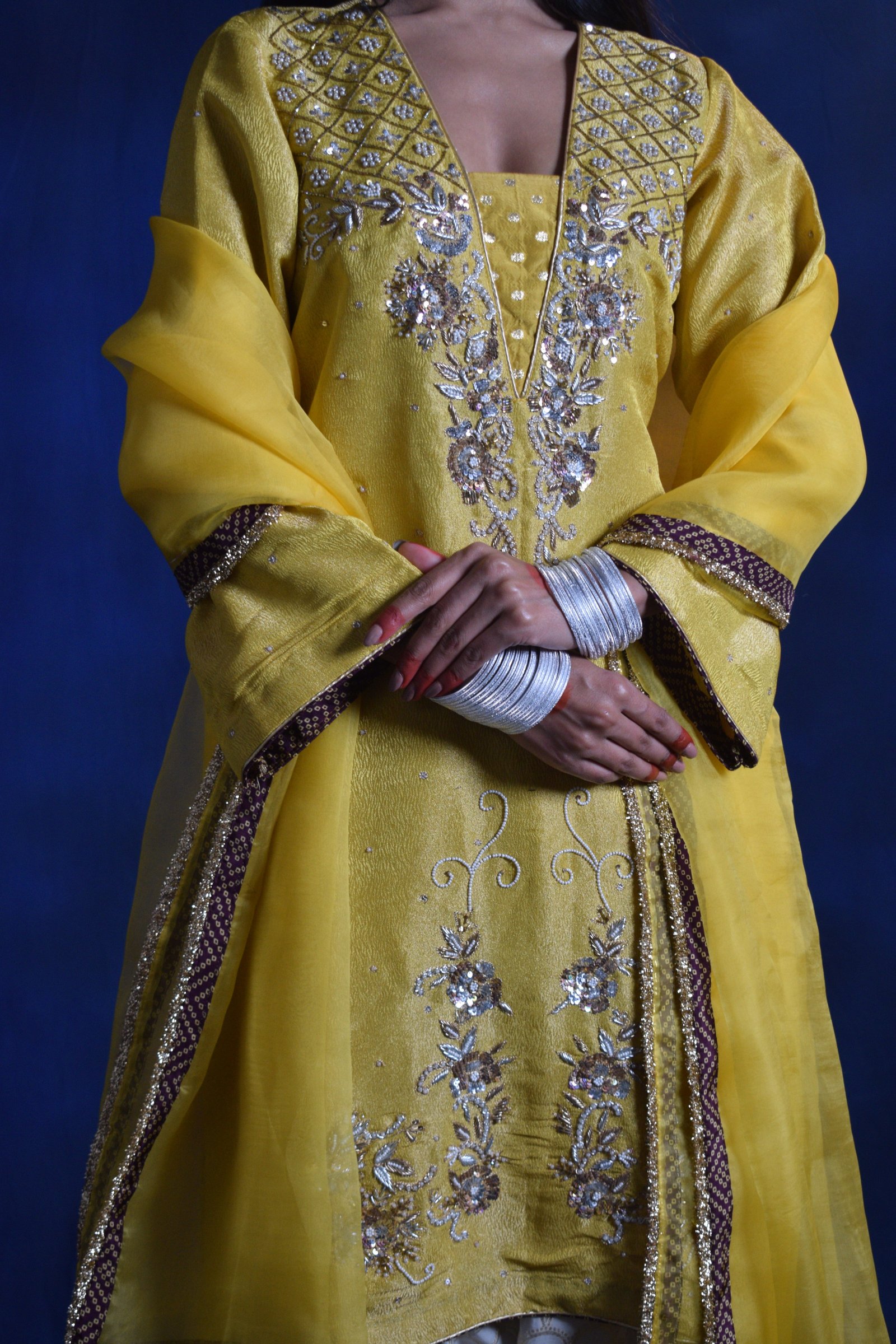 Step into timeless Punjabi elegance with this mustard yellow embroidered suit set, crafted with intricate handwork and paired with a graceful organza dupatta. Perfect for festive celebrations, weddings, and special occasions.