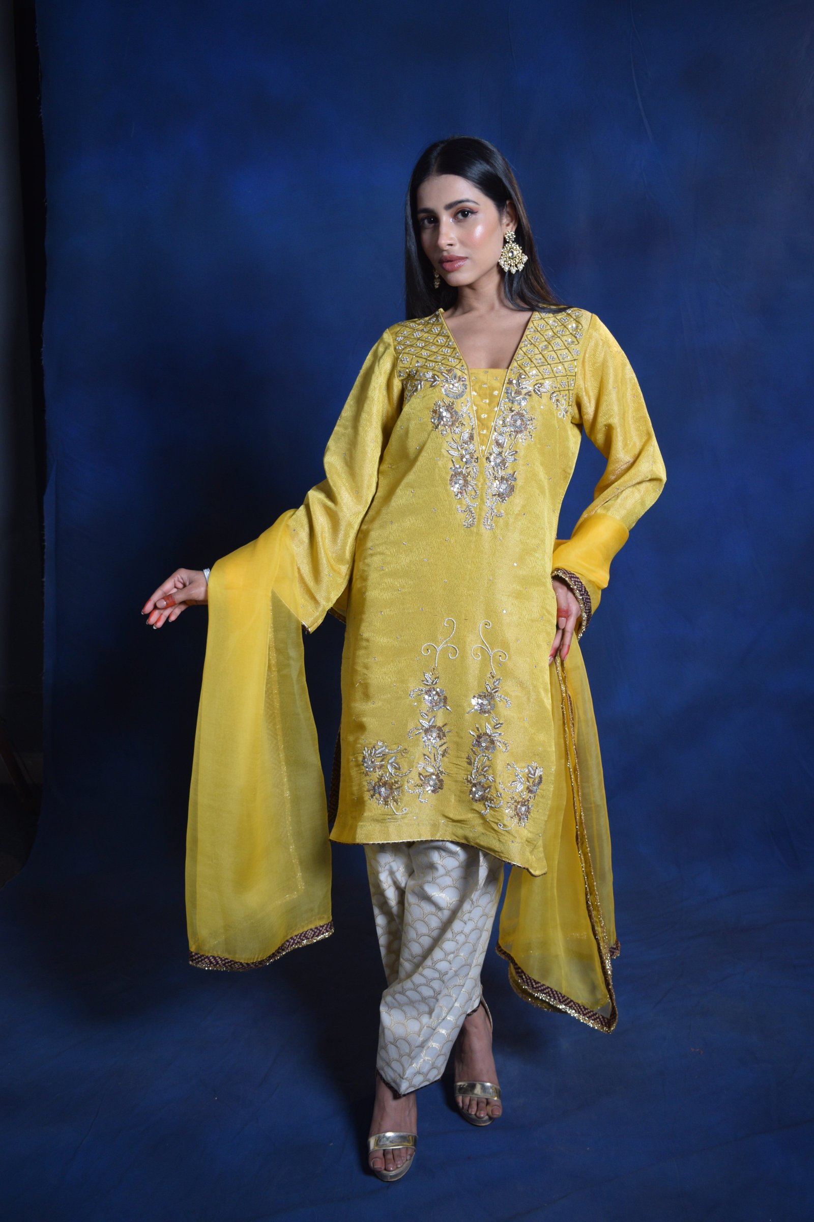 Celebrate refined Punjabi craftsmanship with this luxurious mustard yellow embroidered suit set, designed to exude grace, royalty, and modern elegance. The kurta features detailed silver zari and sequin embroidery on the neckline and front panel, creating a rich yet sophisticated look.