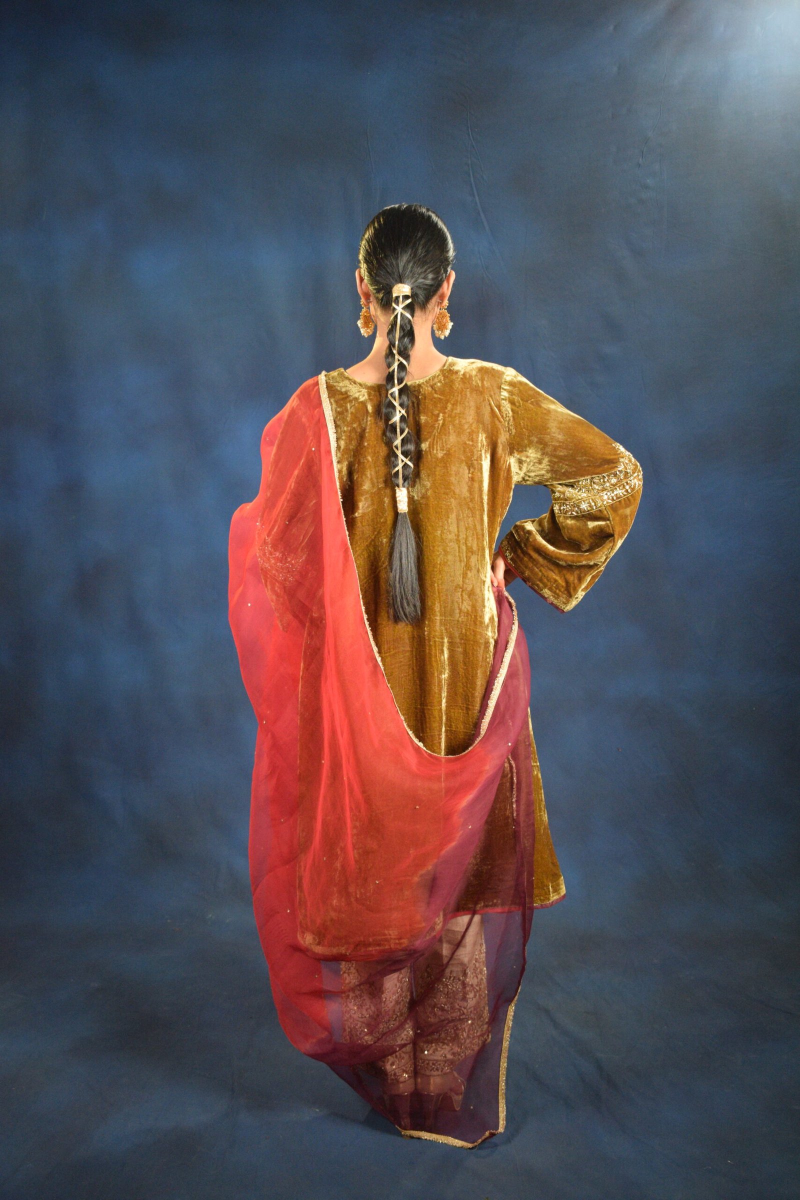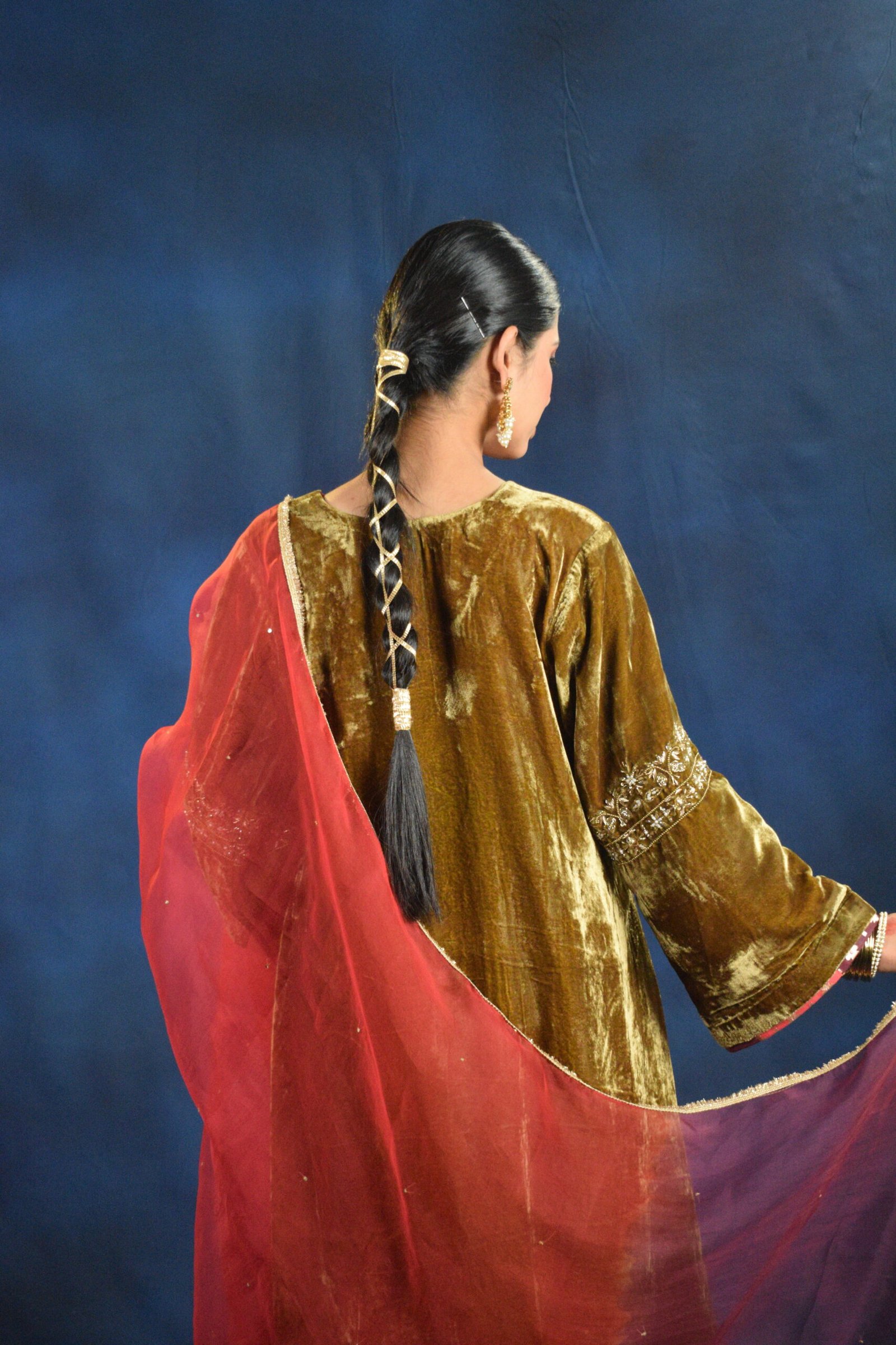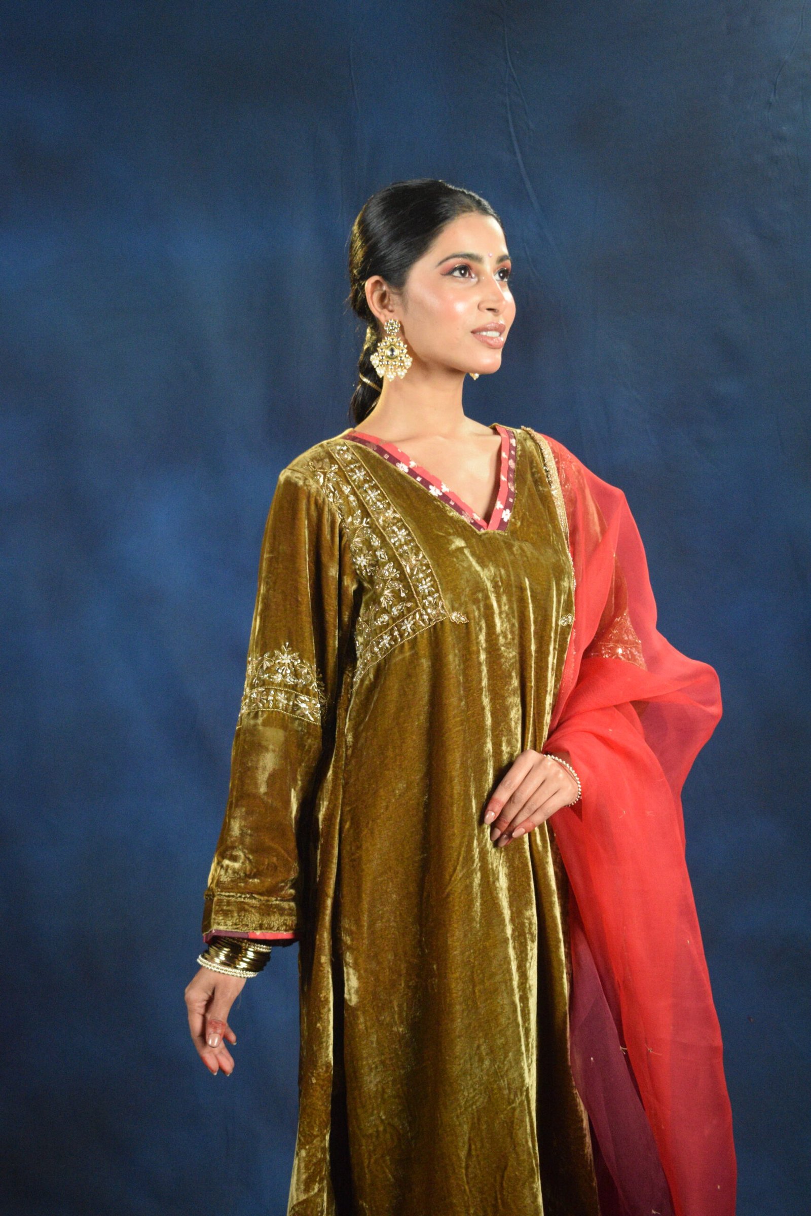 Indulge in royal elegance with the Zehra Velvet Embroidered Kurta Set, crafted for women who appreciate understated luxury. Designed in a rich olive-gold velvet fabric, this kurta features delicate handcrafted embroidery along the neckline and sleeves, adding depth and sophistication to its minimal yet regal silhouette.